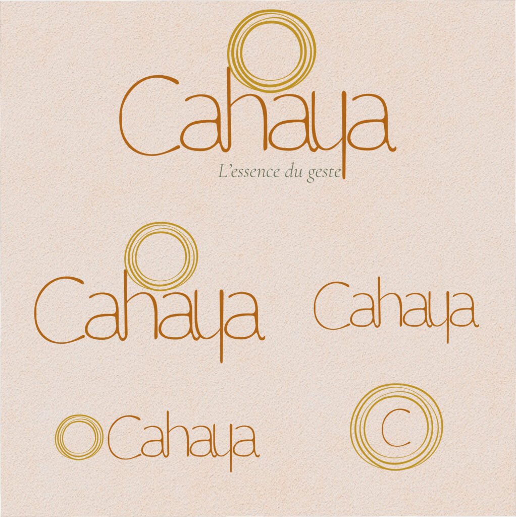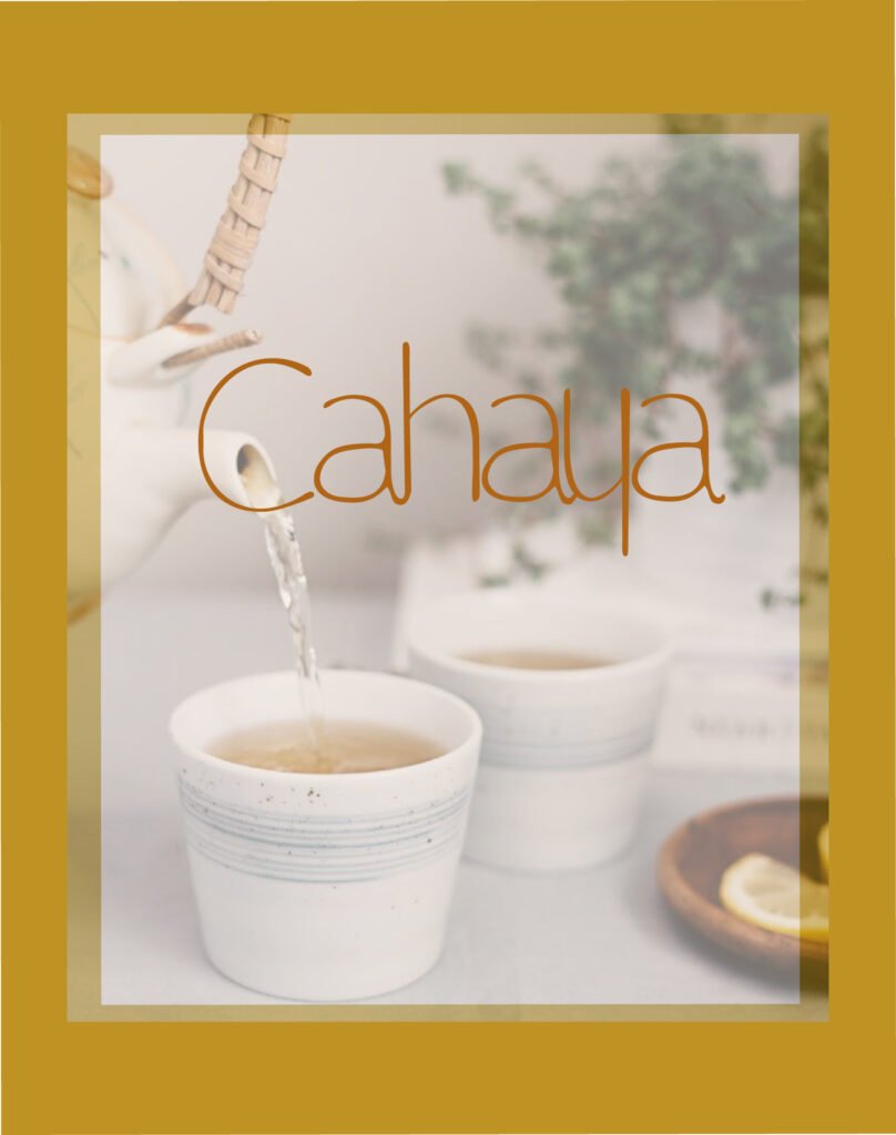 La typographie de « Cahaya » a été retravaillée manuellement pour la rendre unique. Le « h » et le « y » se répondent, pour représenter l’élévation de l’esprit, et l’ancrage à la terre. Le C est comme une étreinte, la parenthèse qui s’ouvre pour s’offrir un moment à soi.